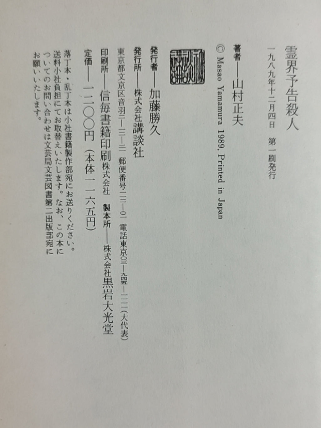 { "书名": "ネゴシエイター(下)", "原书名": "THE NEGOTIATOR", "作者": "フレデリック?フォーサイス(Frederick Forsyth)", "译者": "篠原慎", "出版社": "角川書店", "出版地": "日本", "定价": "1400日元(本体1359日元)", "ISBN": "4-04-791180-1", "书籍类型": "小说/推理·悬疑", "卷册": "下卷", "其他识别码": "C0397 P1400E" } ``` --- ### 书籍二:《霊界予告殺人》 ```json { "书名": "霊界予告殺人", "作者": "山村正夫", "出版日期": "1989-12-04", "版本": "初版", "出版者": "株式会社讲谈社", "发行者": "加藤胜久", "出版地": "日本东京都文京区音羽2-12-21", "印刷所": "信毎书籍印刷株式会社", "制造所": "株式会社黒岩大光堂", "定价": "1200日元(本体1165日元)" }