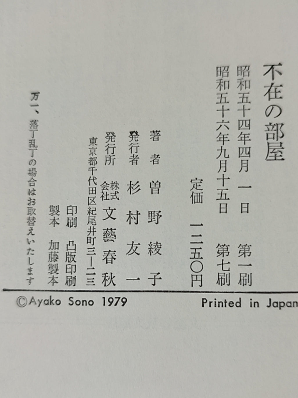 { "书名": "不在的房间", "原书名(日文)": "不在の部屋", "作者": "曾野绫子", "原作者(日文)": "曽野綾子", "出版社": "文艺春秋", "出版地": "东京都千代田区纪尾井町3-23", "初版日期": "1979-04-01", "再版日期": "1981-09-15", "印刷": "凸版印刷", "印制": "加藤制本", "发行人": "杉村友一", "定价": "1250日元", "ISBN/书号": "0093-305320-7384", "版权归属": "Ayako Sono 1979", "印刷地": "日本", "语言": "日文" }
