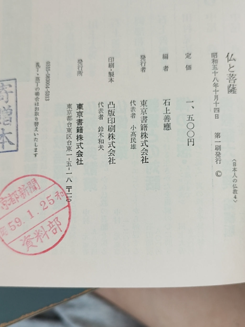 { "书名": "仏と菩薩", "作者": "石上善應", "出版日期": "1983-10-14", "版本": "第一刷", "定价": "1,500日元", "出版者": { "名称": "东京书籍株式会社", "代表者": "小高民雄", "地址": "东京都台东区台东一-二八-六" }, "印刷与装订": { "公司": "凸版印刷株式会社", "代表者": "铃木和夫" } }