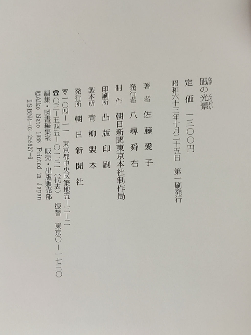 { "书名": "凪の光景", "中文名": "风平浪静的光景", "作者": "佐藤爱子", "定价": "1300日元", "出版日期": "1988-10-25", "ISBN": "4-02-255927-6", "出版社": "朝日新闻社", "出版地": "日本东京中央区筑地5-3-2", "印刷所": "凸版印刷本所印刷所、青柳制本所", "制作": "朝日新闻东京本社制作局", "发行人": "八寻舞右", "分类号": "C0093", "页数": "未标明", "语言": "日语" }