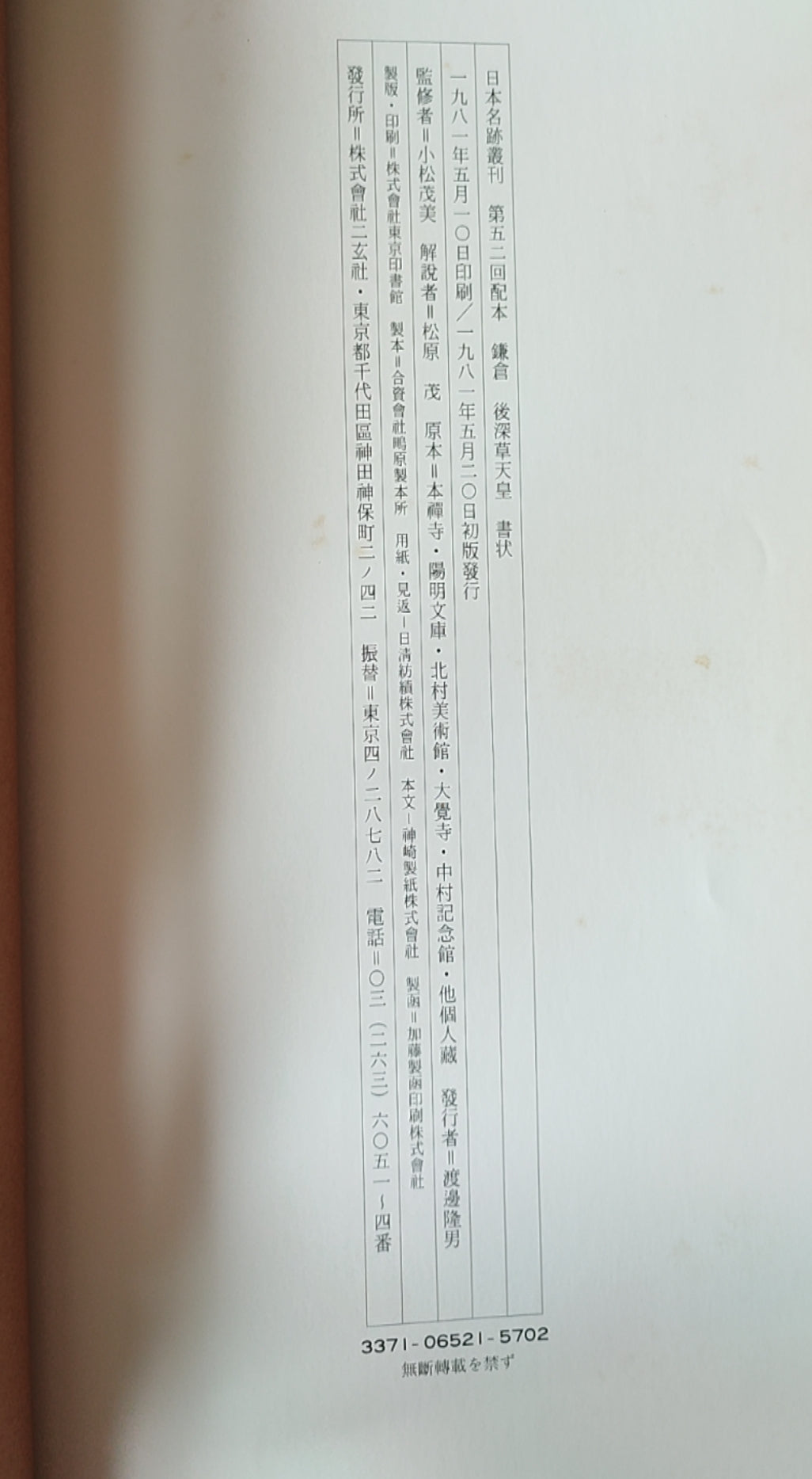{ "书名": "后深草天皇书状", "丛书名": "日本名迹丛刊", "卷次": "第三五回配本", "负责人": { "监修者": "小松茂美", "解说者": "松原茂" }, "出版信息": { "初版发行日期": "1981年5月20日", "印刷日期": "1981年5月20日", "发行所": "株式会社二玄社", "地址": "东京都千代田区神田神保町2-24", "电话": "03-3261-6051" }, "其他信息": { "本册寄藏": [ "阳明文库", "北村美术馆", "大觉寺", "中村纪念馆", "他个人藏" ], "发行人": "渡边隆男", "用纸": "见返:日高特种株式会杜;本文:神鹤制纸株式会社", "印刷": "株式会社广冈书店印刷所", "制本": "加藤製本印刷株式会社" }, "ISBN/书号": "3371-06521-5702", "备注": "未经授权禁止转载" }