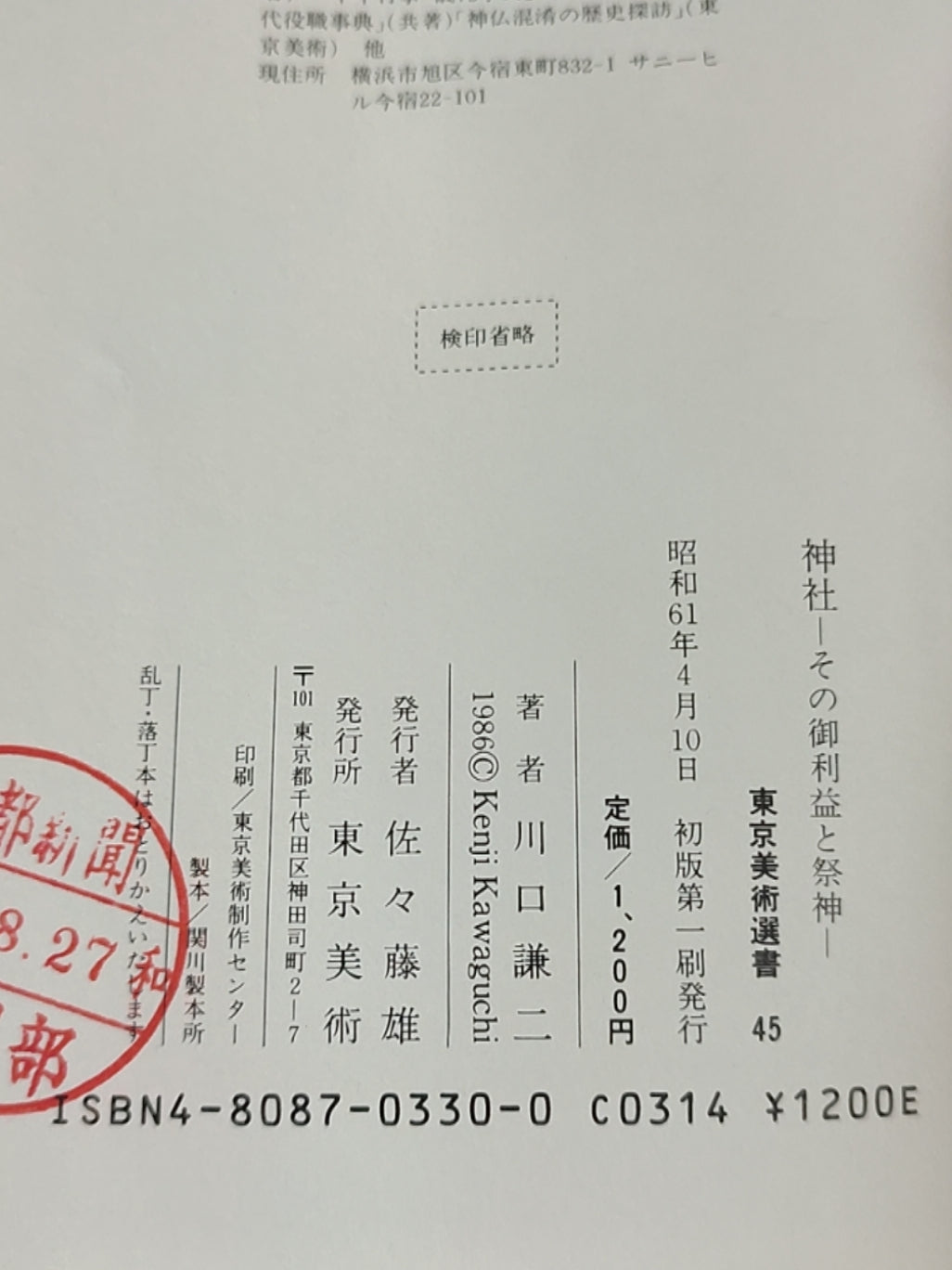{ "书名": "神社——その御利益と祭神", "系列": "東京美術選書", "系列编号": "45", "作者": "川口谦二", "出版社": "東京美術", "出版地": "东京都千代田区神田司町2-7", "发行人": "佐々藤雄", "出版日期": "1986-04-10", "初版": "第一刷", "定价": "1200日元", "ISBN": "4-8087-0330-0", "著作权标注": "1986? Kenji Kawaguchi", "印刷所": "东京美术制作中心", "印制所": "东京美术制作中心" }